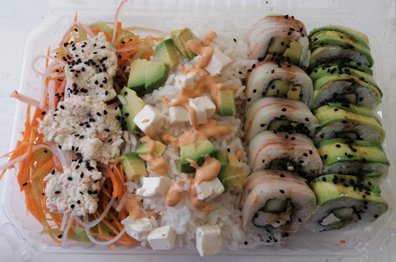 Una selección fresca y ligera que incluye media ensalada kani kiuri especial, medio gohan que sushi, medio aguacate y medio rollo de kani maki. Perfecto para una comida deliciosa y nutritiva.