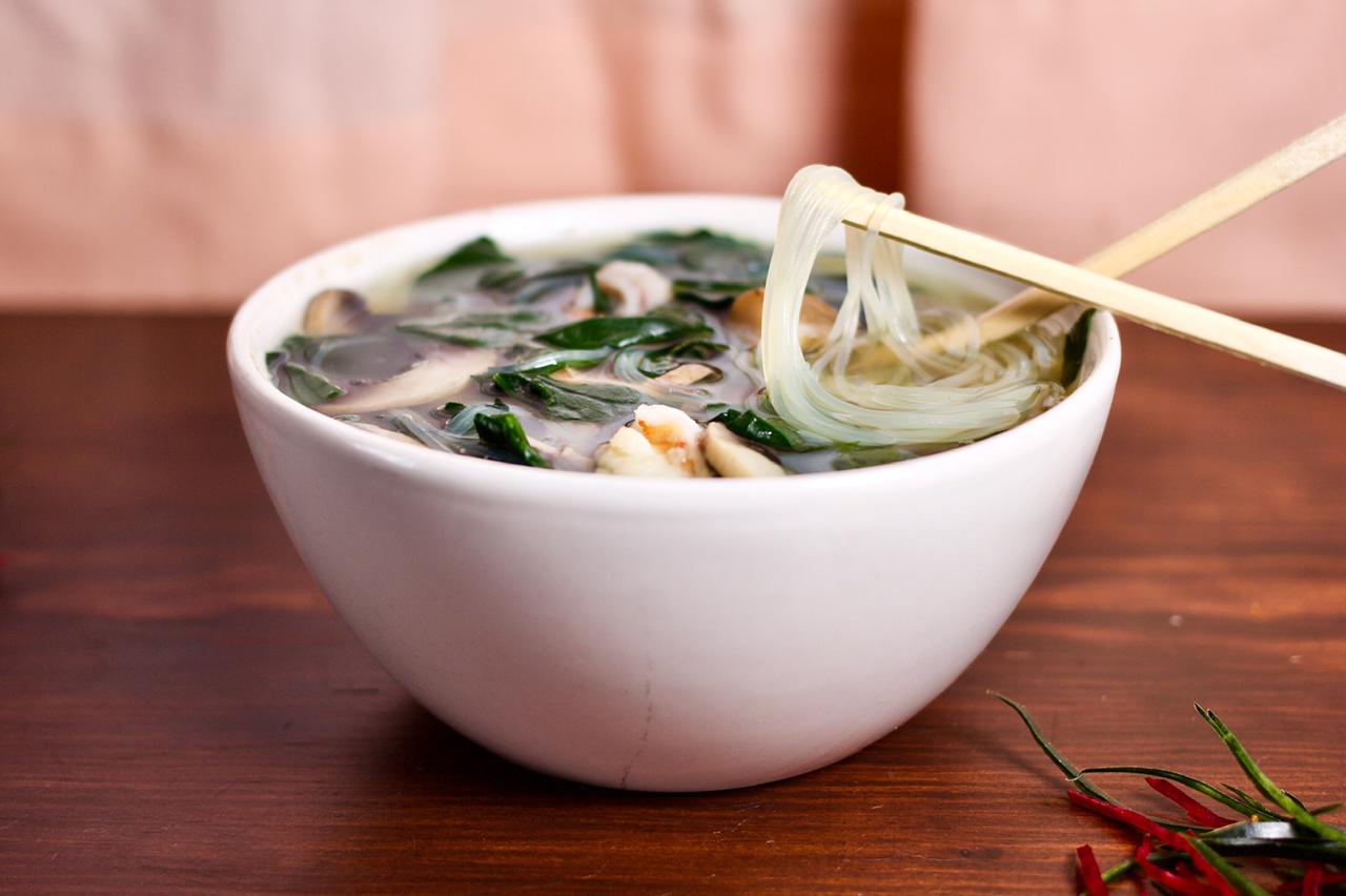Refrescante sopa ligera con lluvia de primavera, wakame, champiñón y camarón, ideal para empezar tu comida.