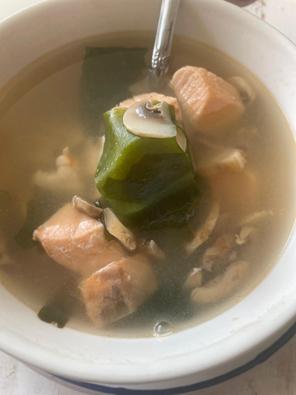 Deliciosa sopa de frijol de soya con wakame, camarón, calamar, salmón y champiñón, un festín del mar en cada sorbo.