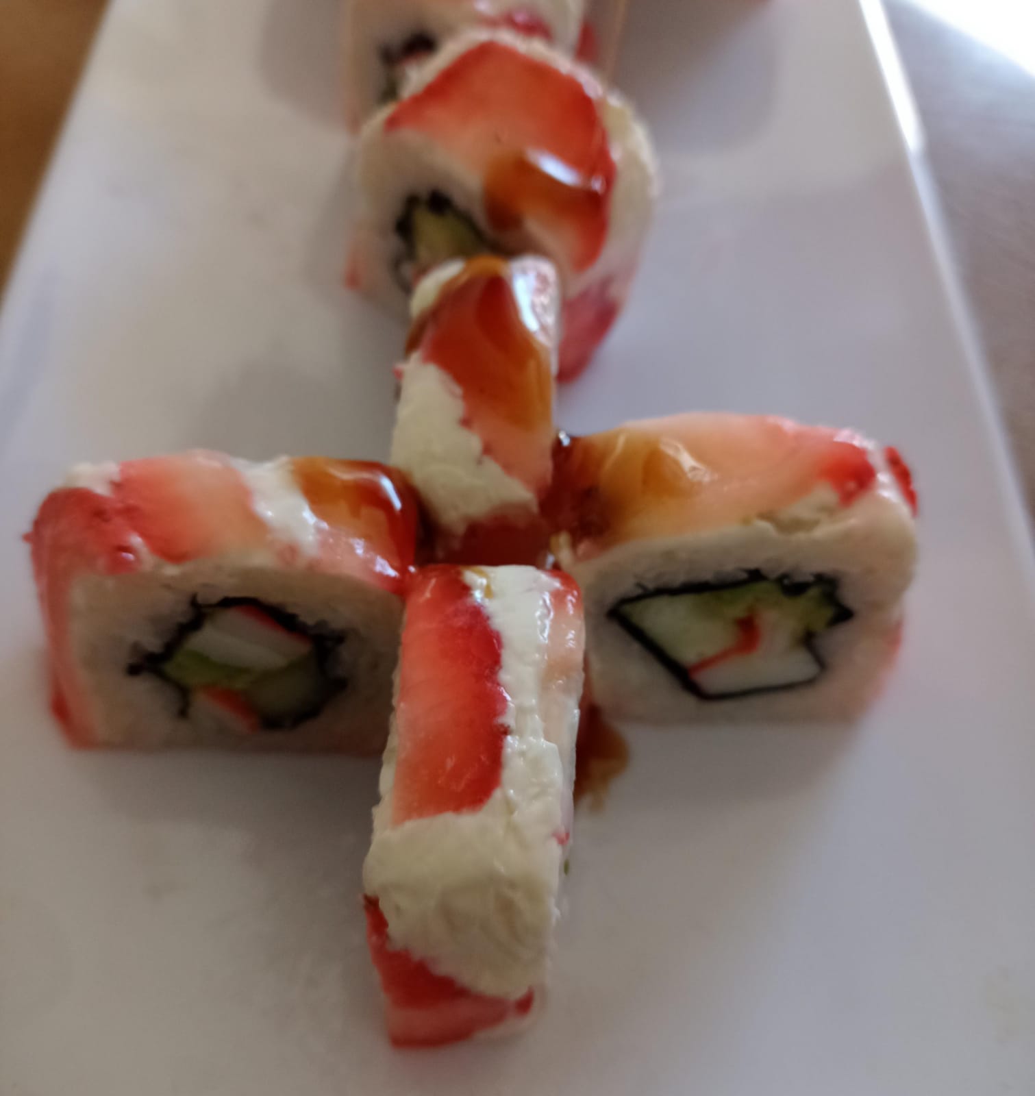 Surimi, aguacate y queso Philadelphia en el interior, con un toque de fresa y salsa de anguila por fuera. ¡Una experiencia única para el paladar!.