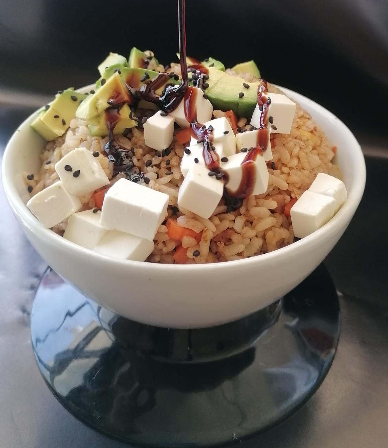 Arroz frito con verduras, res, pollo y camarón, acompañado de aderezo tampico.