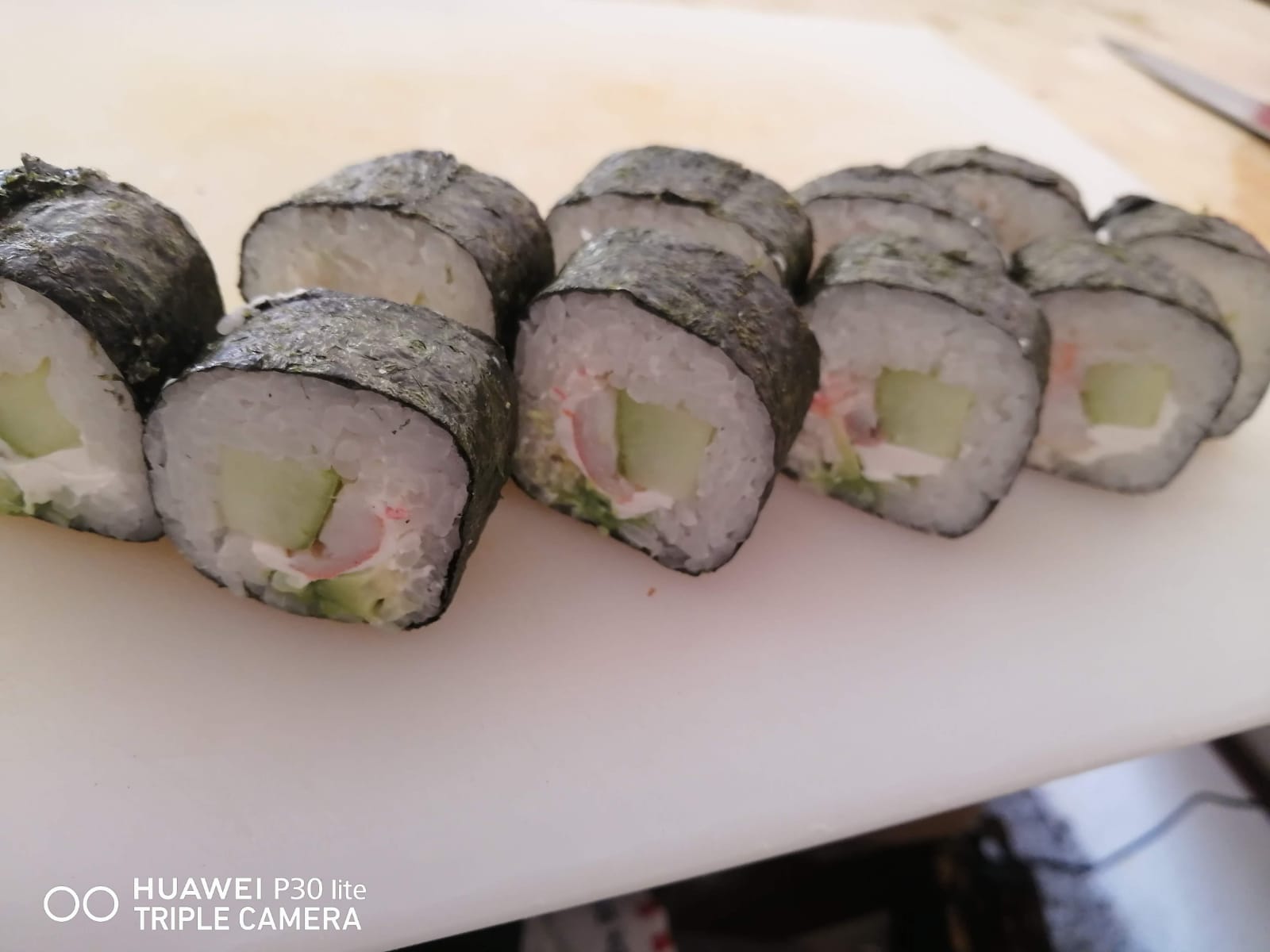 Relleno de pepino, aguacate y surimi. Por fuera, queso Philadelphia.