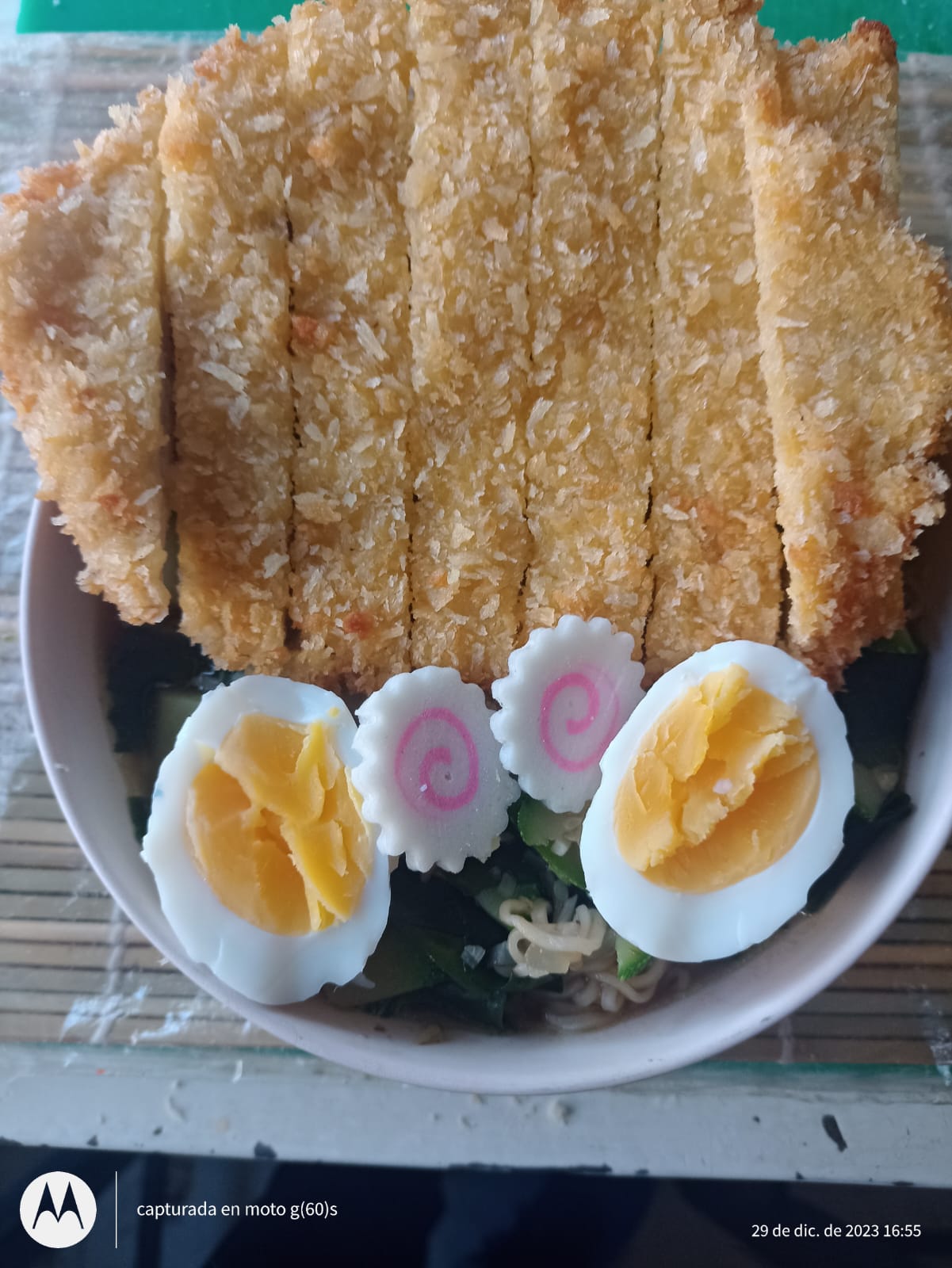 Ramen acompañado de naruto, edamames, grano de elote, huevo duro y pechuga empanizada, una receta llena de texturas y sabores.