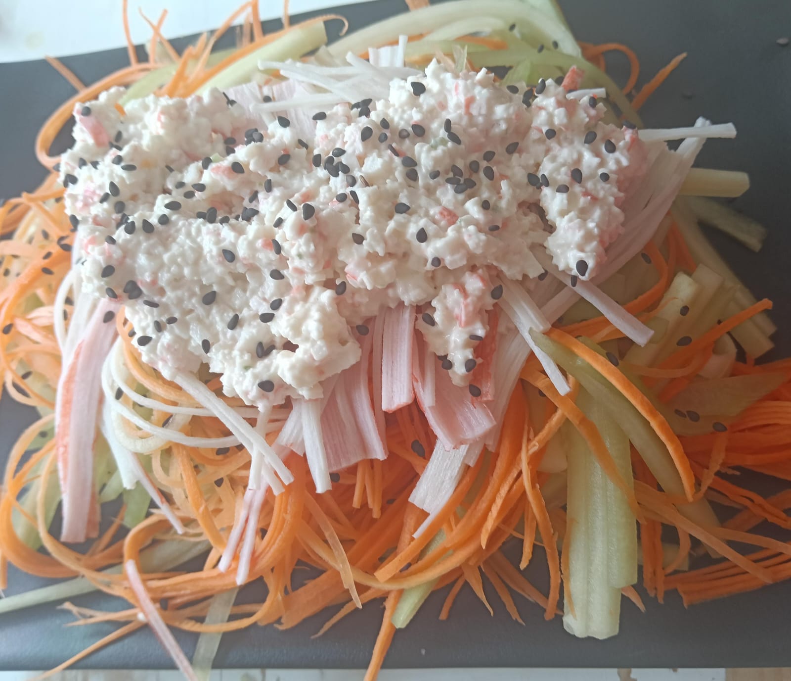 Pepino, zanahoria, cangrejo acompañado de aderezo Tampico y ajonjolí