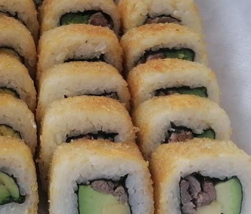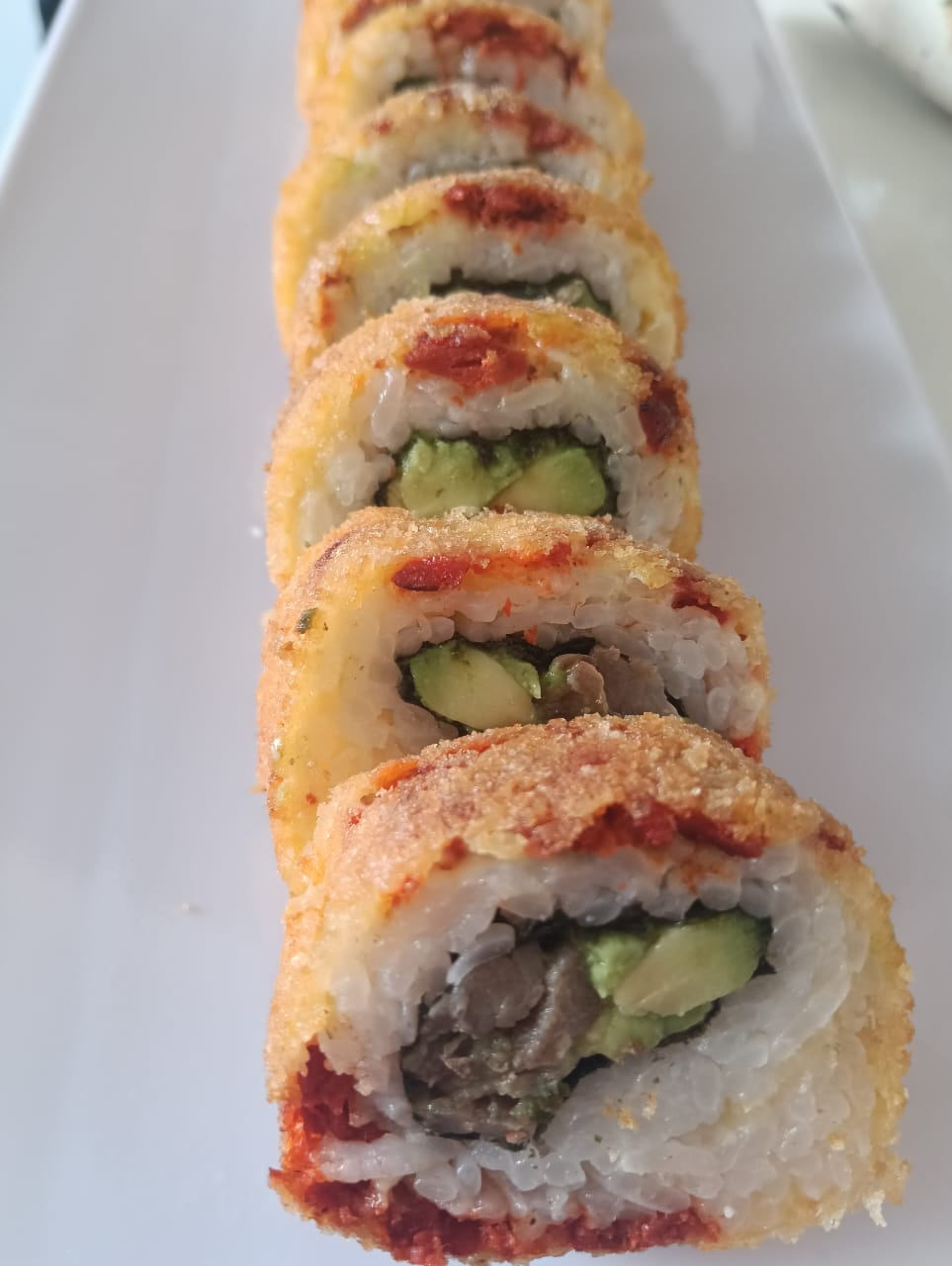 Aguacate, Philadelphia y jugosa arrachera, todo con un delicioso empanizado.