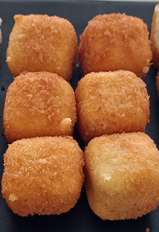 Crujientes cubos de queso manchego empanizado (6 piezas), derretidos por dentro y dorados por fuera.