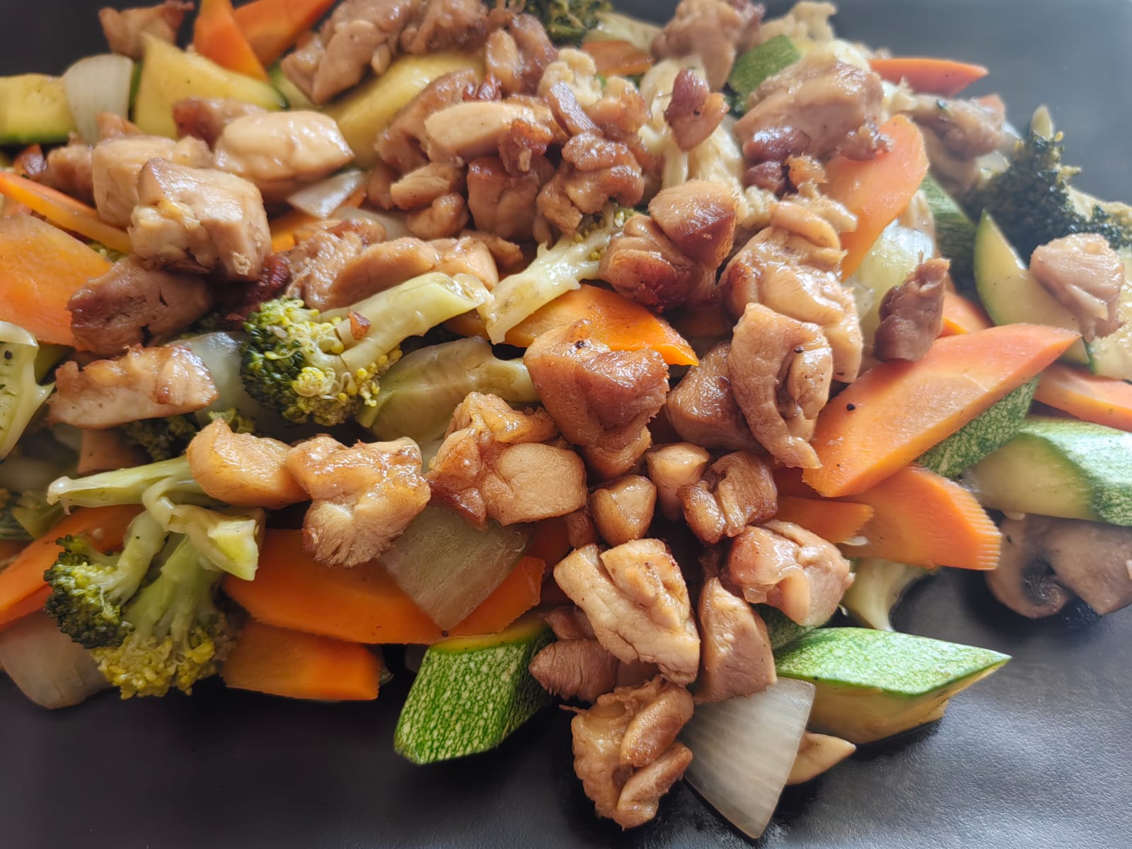 Jugosos trozos de pollo salteados a la plancha con verduras al estilo oriental.