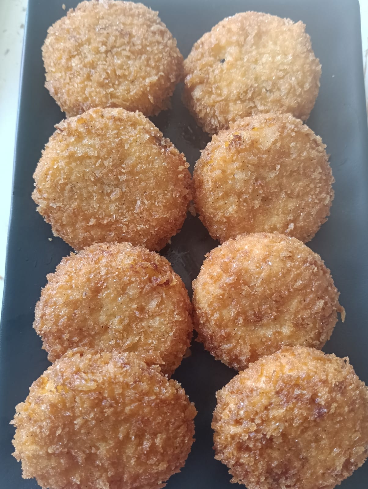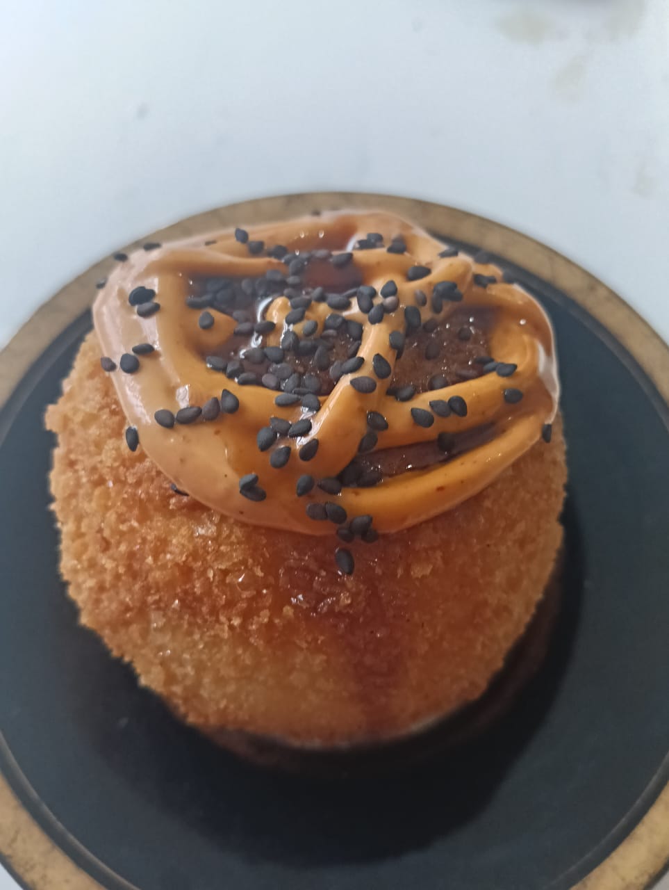 Bolas de arroz empanizado rellenas de camarón, bañadas en salsa de anguila y chipotle.