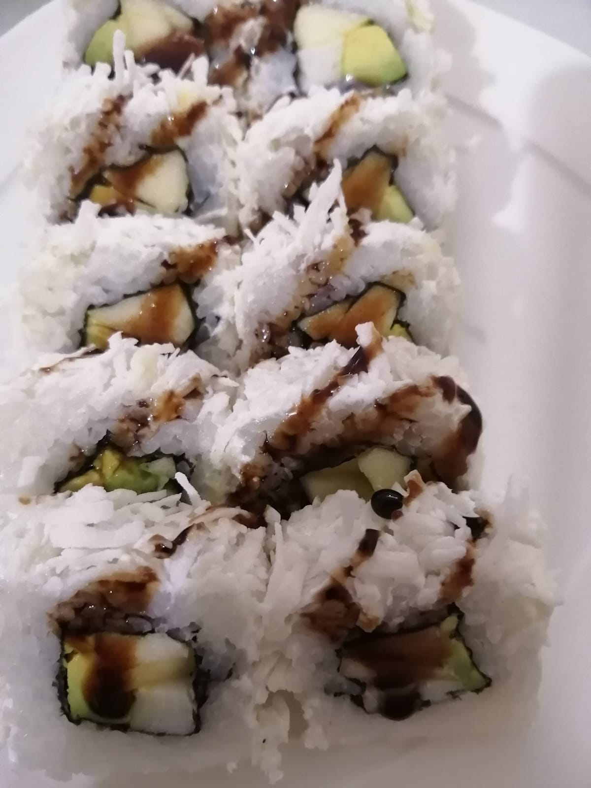 Relleno de aguacate, manzana y surimi, con coco rallado y salsa de anguila por fuera. ¡Una explosión de sabor tropical!.