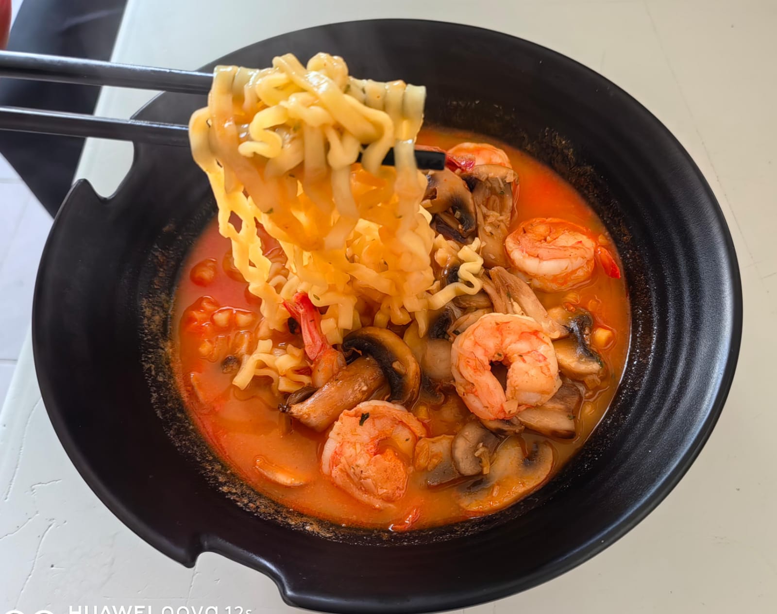 Ramen picoso con camarón y champiñón a la mantequilla, una explosión de sabor con un toque cremoso.
