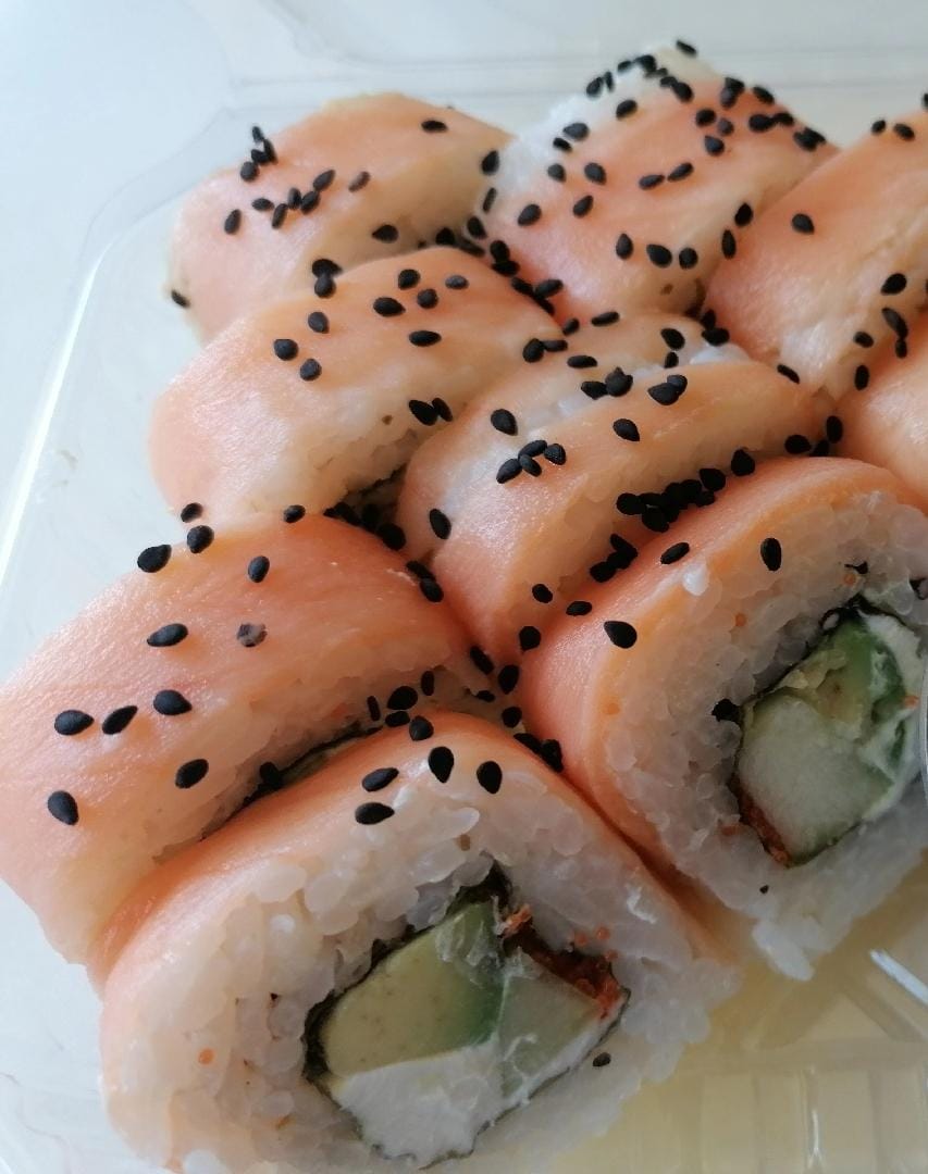 Aguacate, pepino, masago y queso Philadelphia por dentro, y una capa de salmón y ajonjolí por fuera.