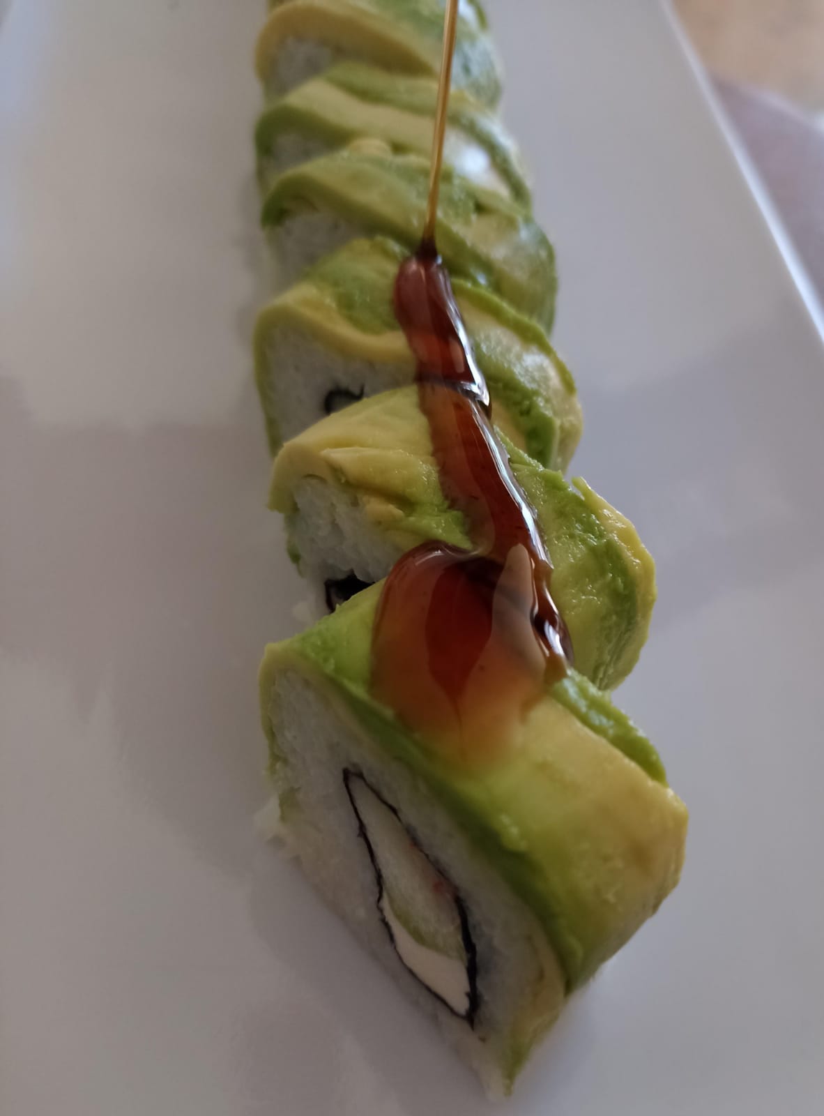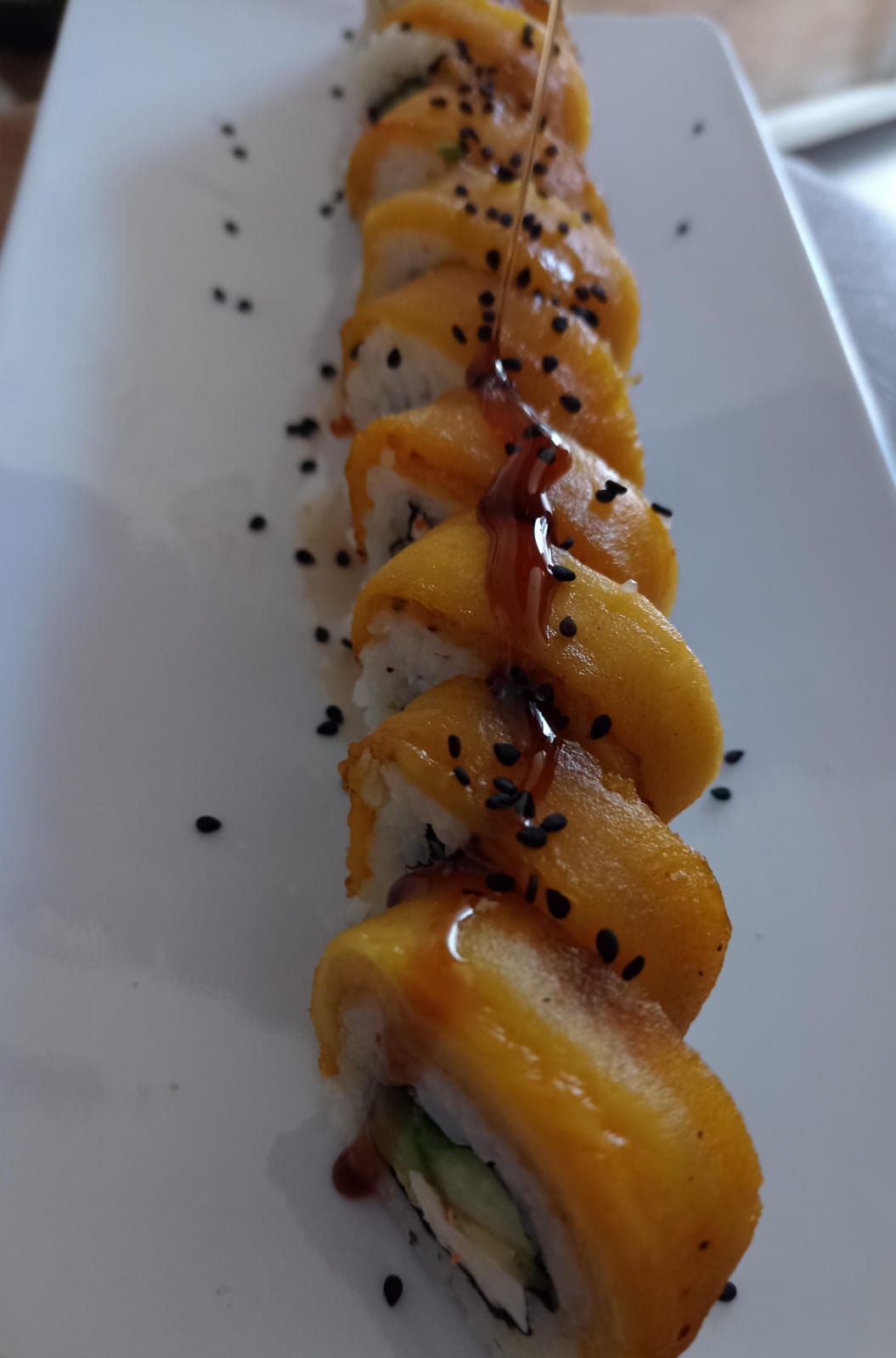 Relleno de pepino, aguacate, masago y queso Philadelphia. Por fuera, plátano macho, salsa de anguila y ajonjolí. ¡Una mezcla de sabores dulces y salados que te encantará!.