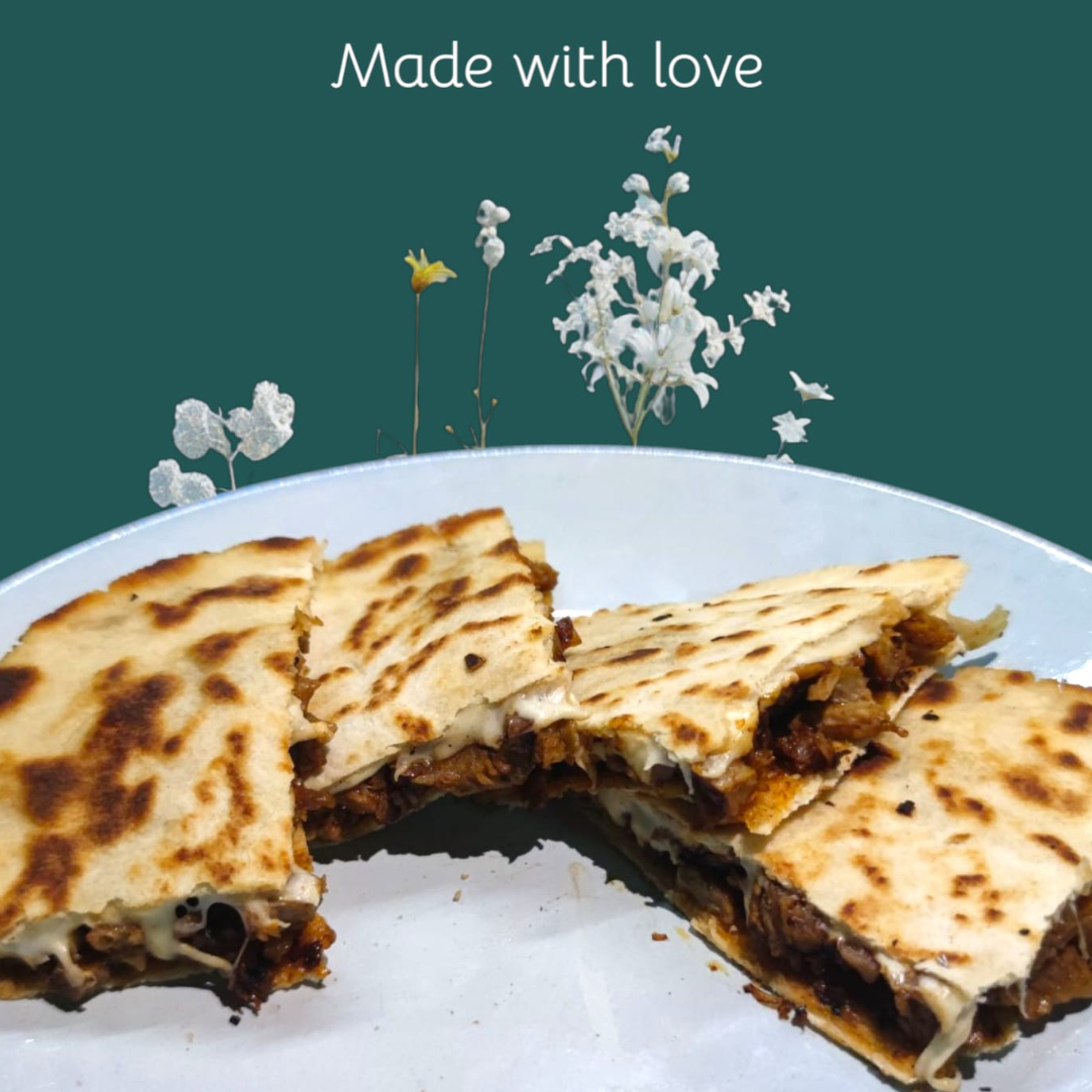 Doble pan árabe dorado, relleno de abundante queso vegano acompañado de la proteina de tu elección, cilantro, cebolla.