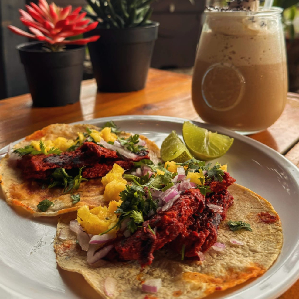 Queso vegano, pomodoro, pastor, piña, cilantro y cebolla