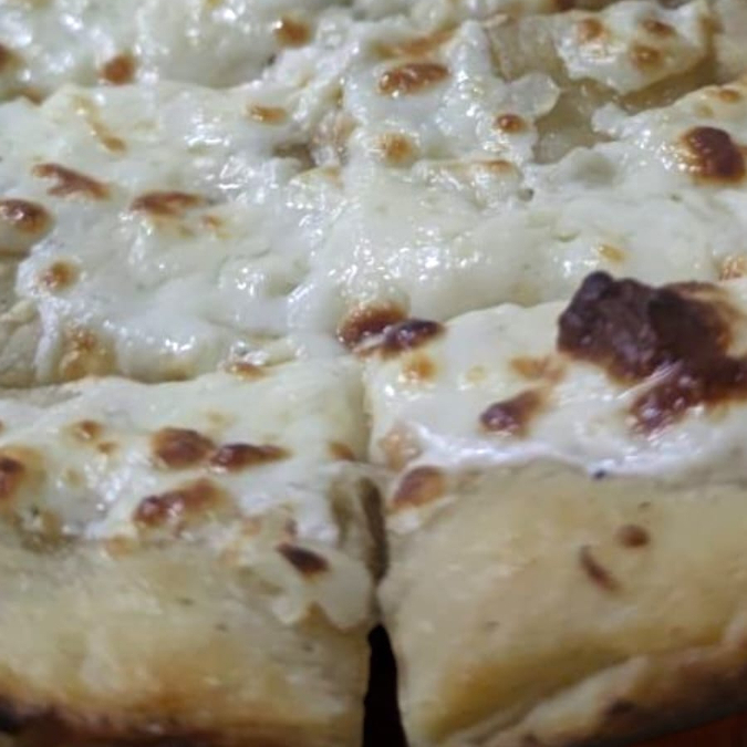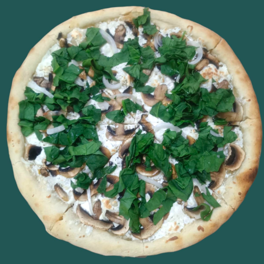 Base de aceite de ajo casero , Queso vegano, espinaca, champiñones, cebolla morada.