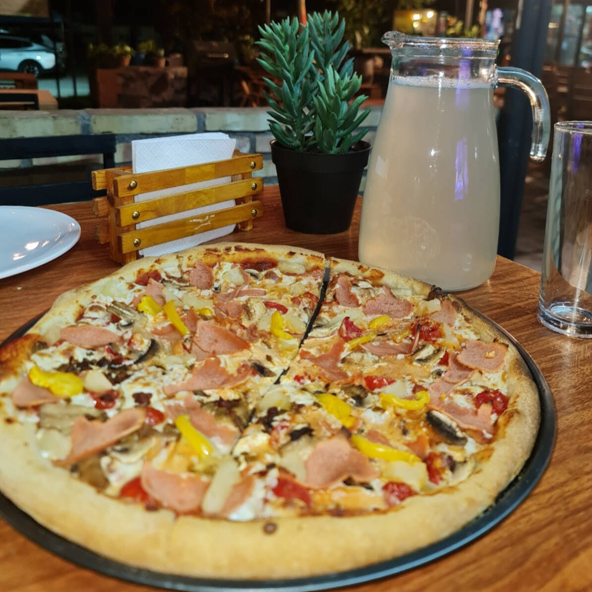 Queso vegano, pomodoro, jamón salchicha, chorizo y cebolla.