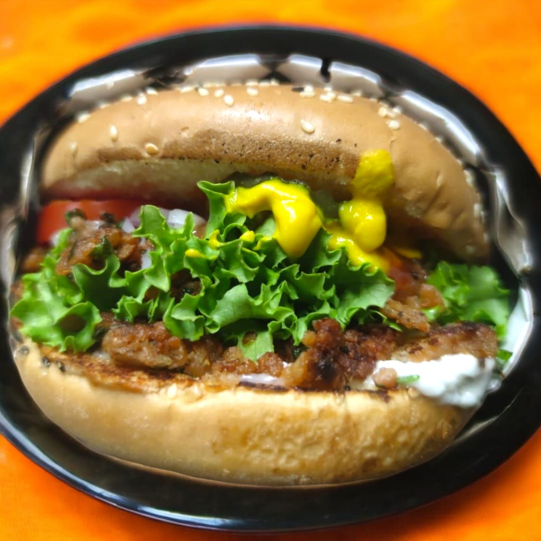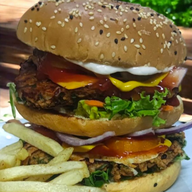 Tres pisos de delicioso sabor, dos carnitas de hamburguesa, lechuga, cebolla jitomate, pepinillos , queso amarillo, queso mozzarella, ketchup, veganesa.