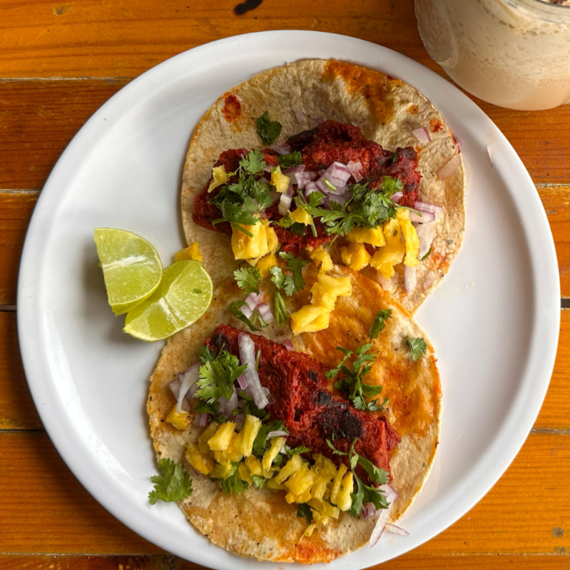 Proteina de soya estilo pastor acompañado de piña, cilantro y cebolla