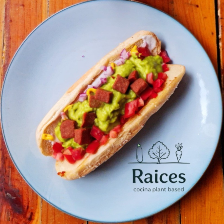 Proteína de la casa, veganesa, lechuga, cebolla, jitomate, pepinillos espinaca, guacamole, queso amarillo, mostaza y ketchup.