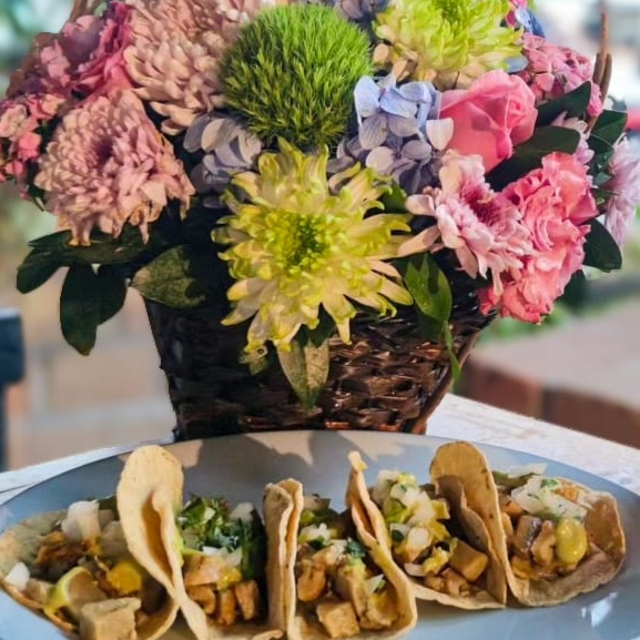 Proteina de trigo con sazón de la casa tipo bistek, acompañado de guacamole, cilantro y cebolla