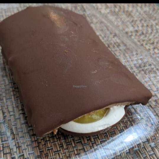 Pan de chocolate relleno de crema sabor vainilla y mermelada de piña, cubierto de chocolate.