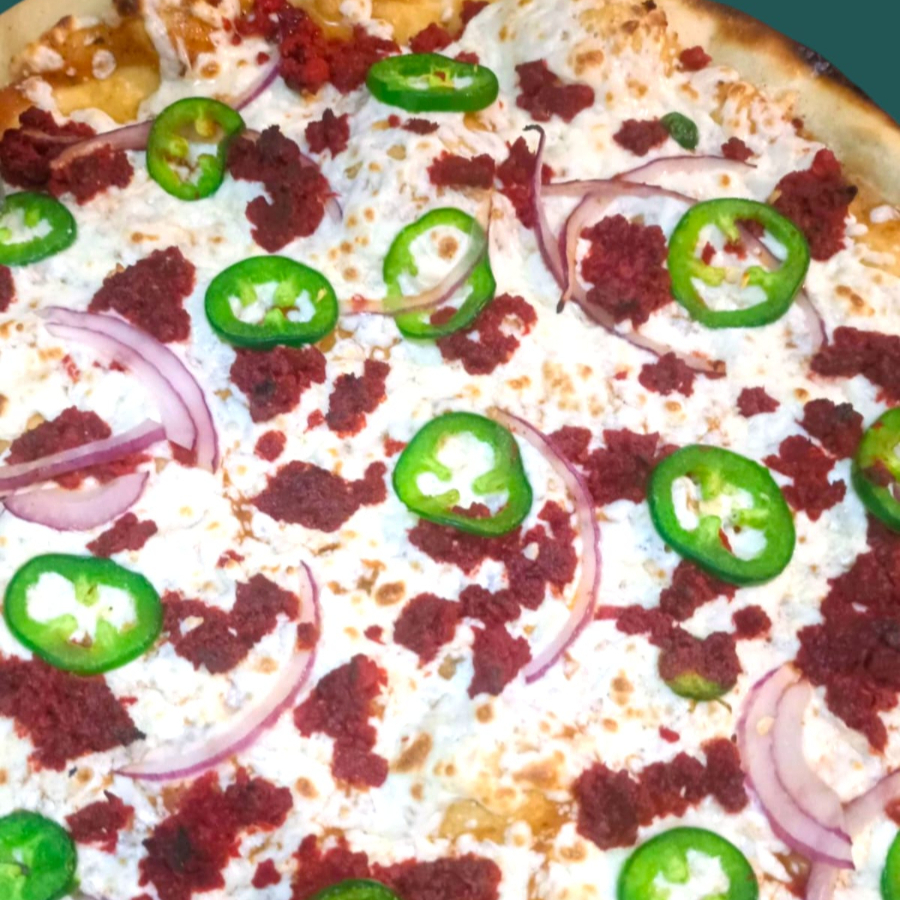 Queso vegano, pomodoro, chorizo, jalapeño y cebolla.