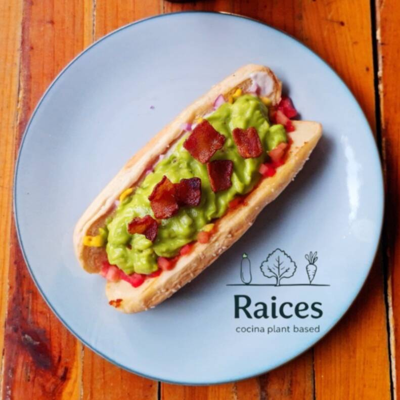 Salchicha de la casa, chorizo, guacamole, rajitas, Veganesa, jitomate cebolla, mostaza y ketchup.