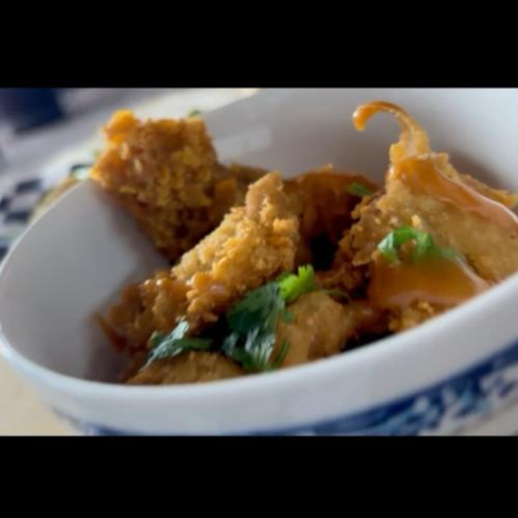 setas empanizadas y fritas acompañadas con salsa hot wings o BBQ