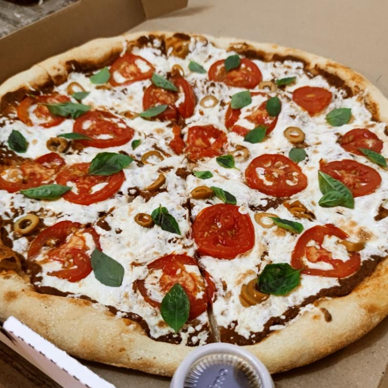 Queso vegano, salsa pomodoro, aceitunas, orégano y albahaca fresca.