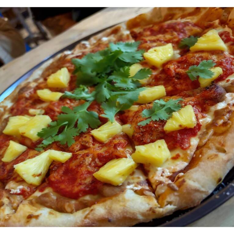 Queso vegano, pomodoro, jamón y piña.