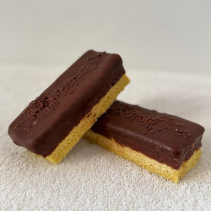 Pan de vainilla con crema sabor vainilla , mermelada de fresa con cobertura de chocolate.