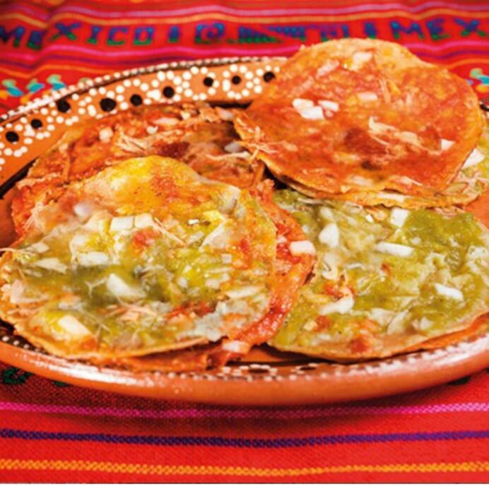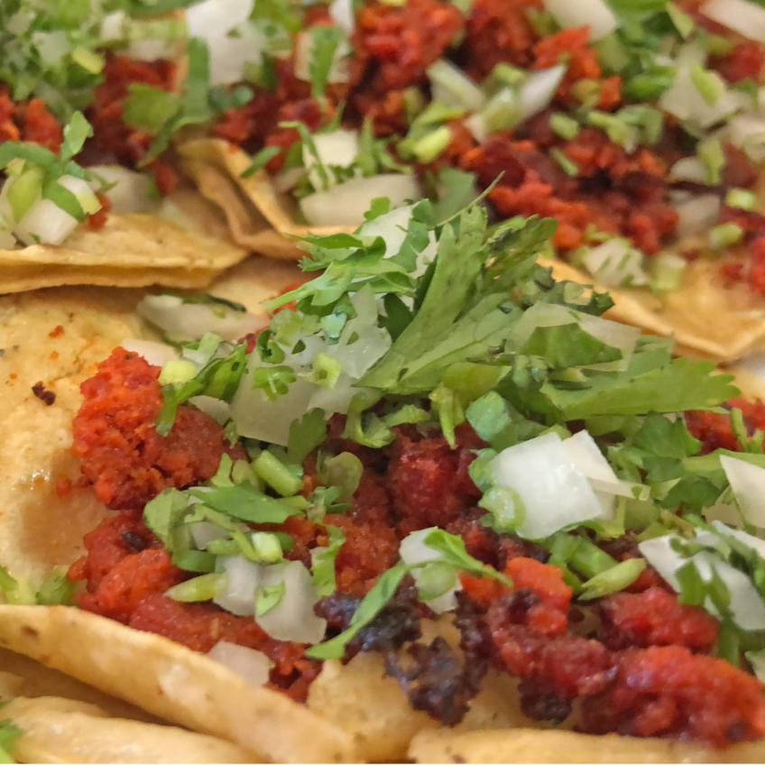 Proteina de soya en salsa de chiles acompañadobde guacamole, cilantro y cebolla
