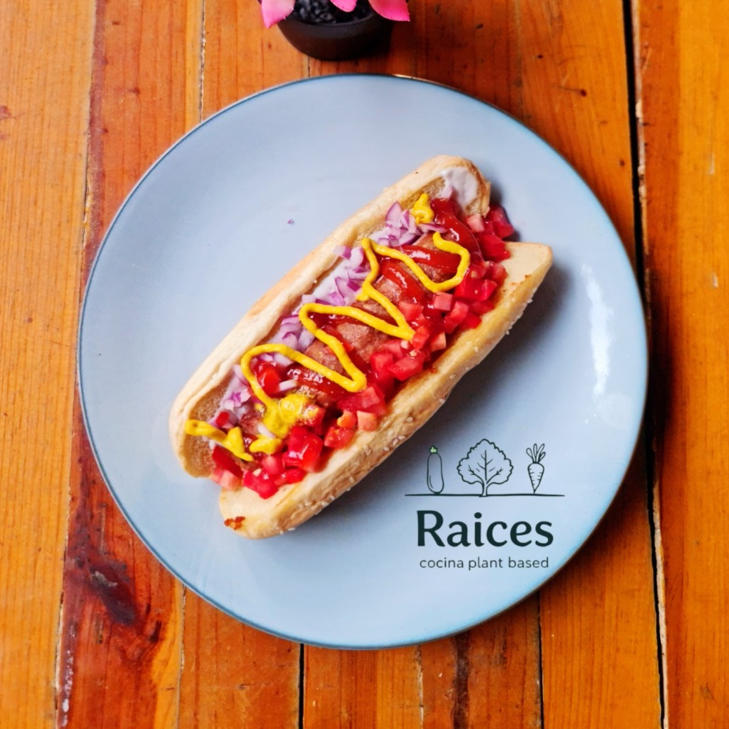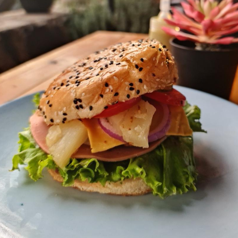 Proteína de la casa, veganesa, lechuga, cebolla, jitomate, pepinillos, piña asada, queso amarillo , jamón, mostaza y ketchup.