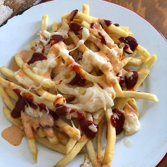 Orden de papas a la francesa con queso y bites de tocino