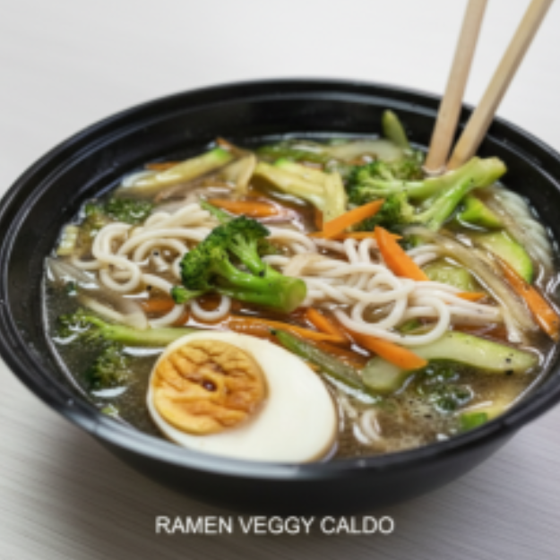 250 g De fideos, 100 g de arrachera (peso crudo), medio huevo cocido, brócoli, apio, calabaza, zanahoria, cebolla y fondo especial de la casa.