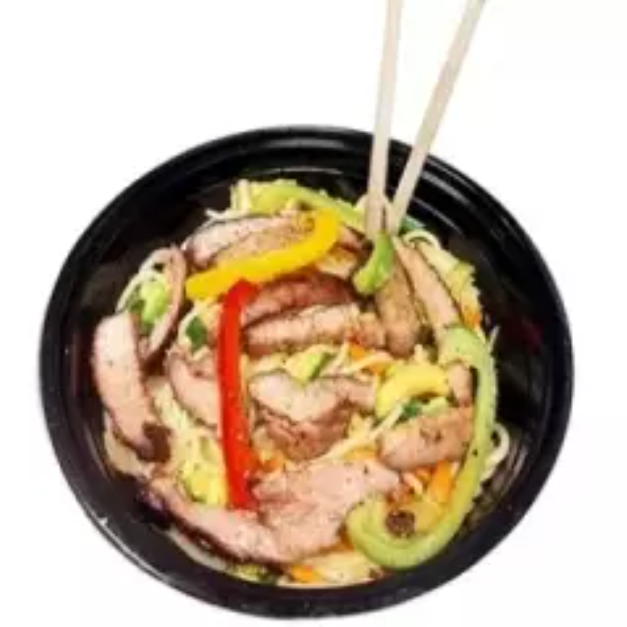 300 g De fideo salteado al wok, sin fondo, 100 g de arrachera (peso crudo) con brócoli, apio, zanahoria, calabaza y cebolla.