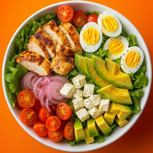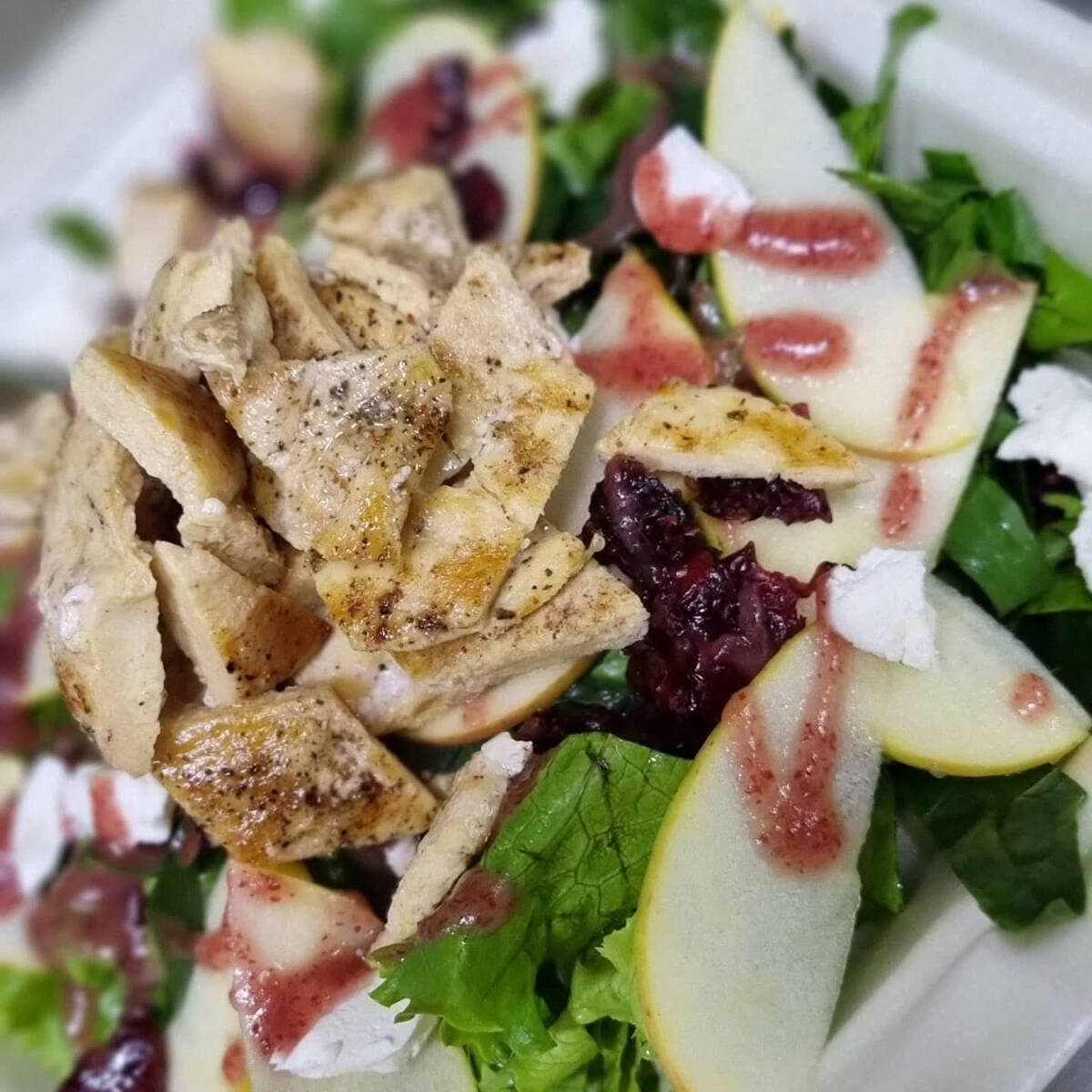 150 gr de pollo lechuga, espinaca, huevo hervido, jitomate cherry, aguacate, pepino, aceite de oliva y hiervas italianas