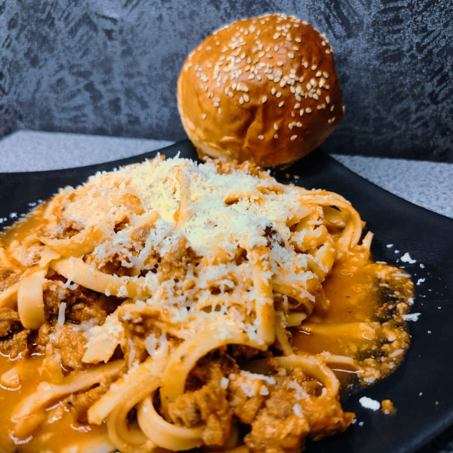 180 gr, de pasta fetuchini, salsa pomodoro, 100 gr de bologñesa, queso parmesano y delicioso pan a degustar.