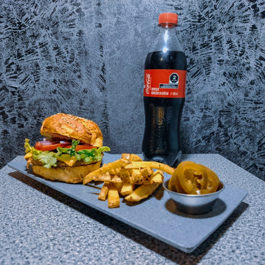 Hamburguesa Sencilla, Papas a la francesa 150 gr, y refresco 600 ml. a elegir