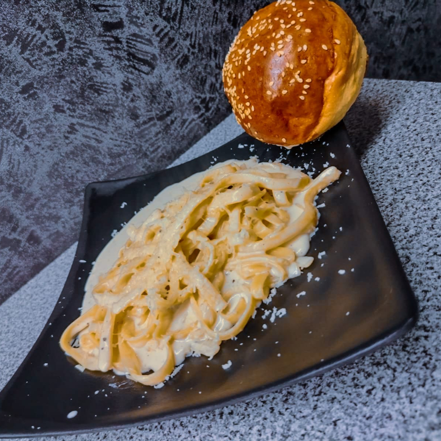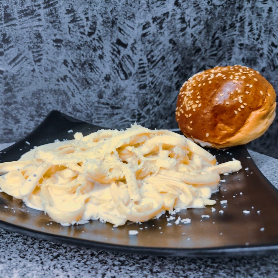 180 gr de pasta fetuchini, queso gorgonzola, queso parmesano, queso crema, sazonadores y delicioso pan a degustar.