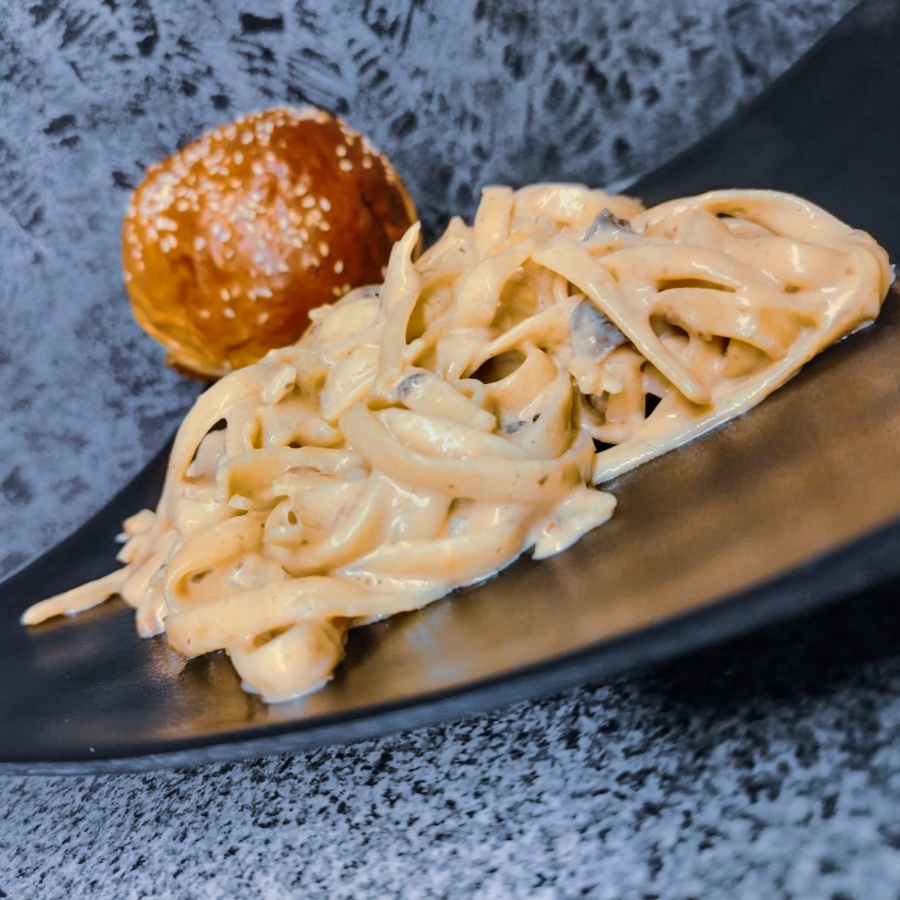 180 gr de pasta fetuchini, champiñones, leche, crema, sazonadores y delicioso pan a degustar.