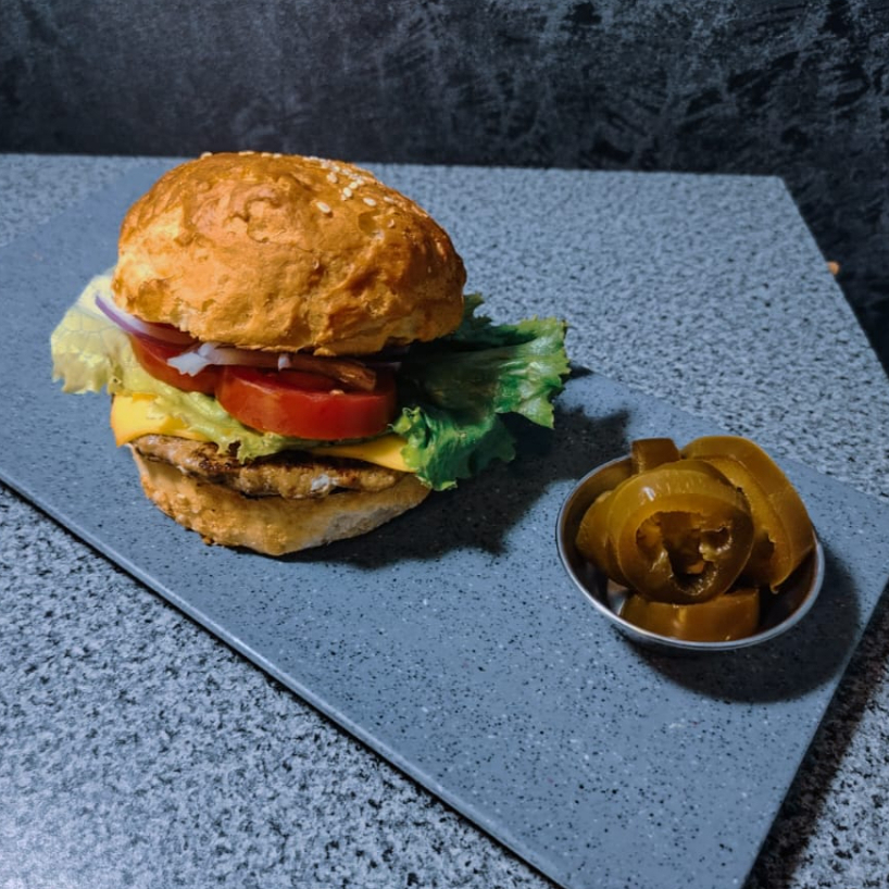 Pan artesanal, carne 100 gr. lechuga, cebolla morada, jitomate, queso americano, mayonesa y rajas en rodajas.
