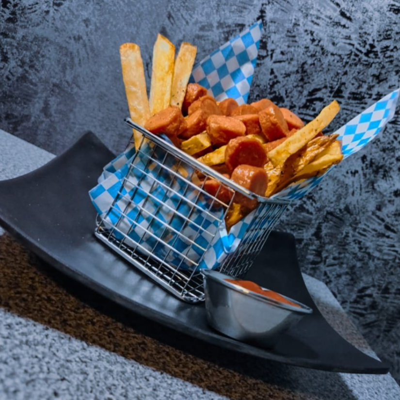 Papas a la francesa, salchichas en rodajas. Acompañadas de catsup, valentina y queso amarillo fundido.