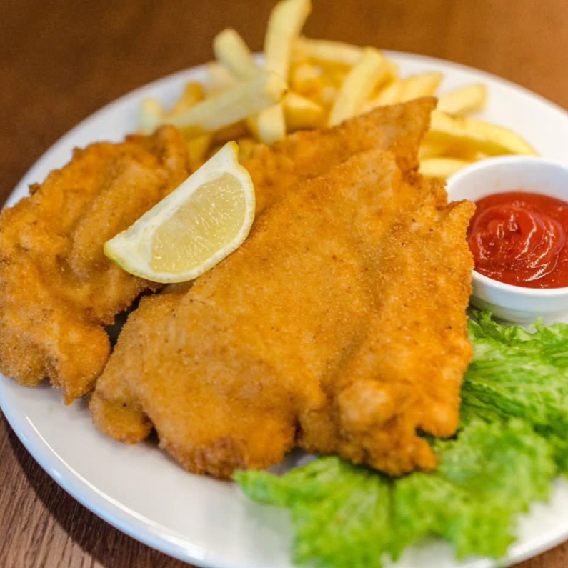 Milanesa de pollo 150 gr acompañada de ensalada, papas a la francesa, 2 pz de tortillas y salsa habanero.
