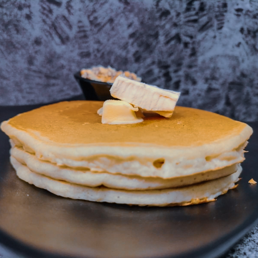 3 pz de hot cakes. Acompañadas con aperitivo a elegir y mantequilla.