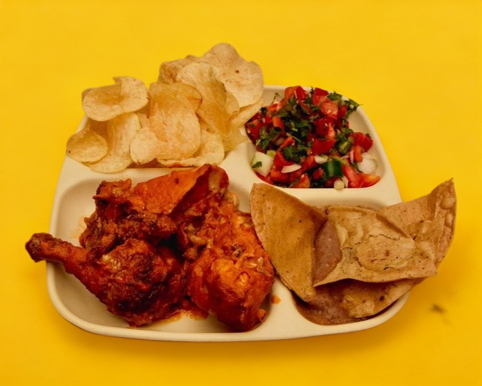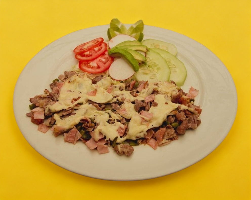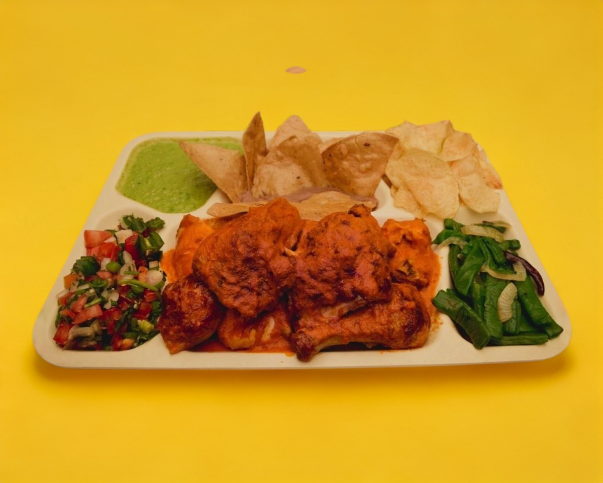 Acompañado de papas, frijoles, totopos, pico de gallo, arroz, guacamole, rajas, salsa y tortillas.