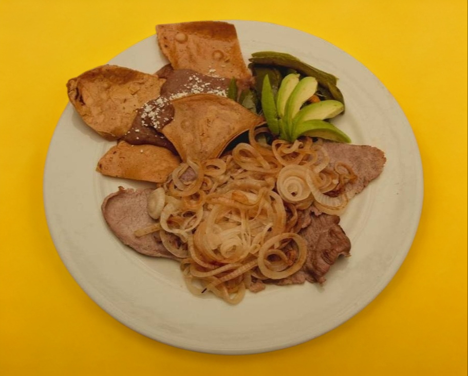 Acompañado de frijoles, totopos, rajas, aguacate y tortillas.