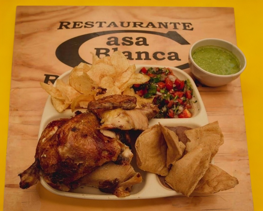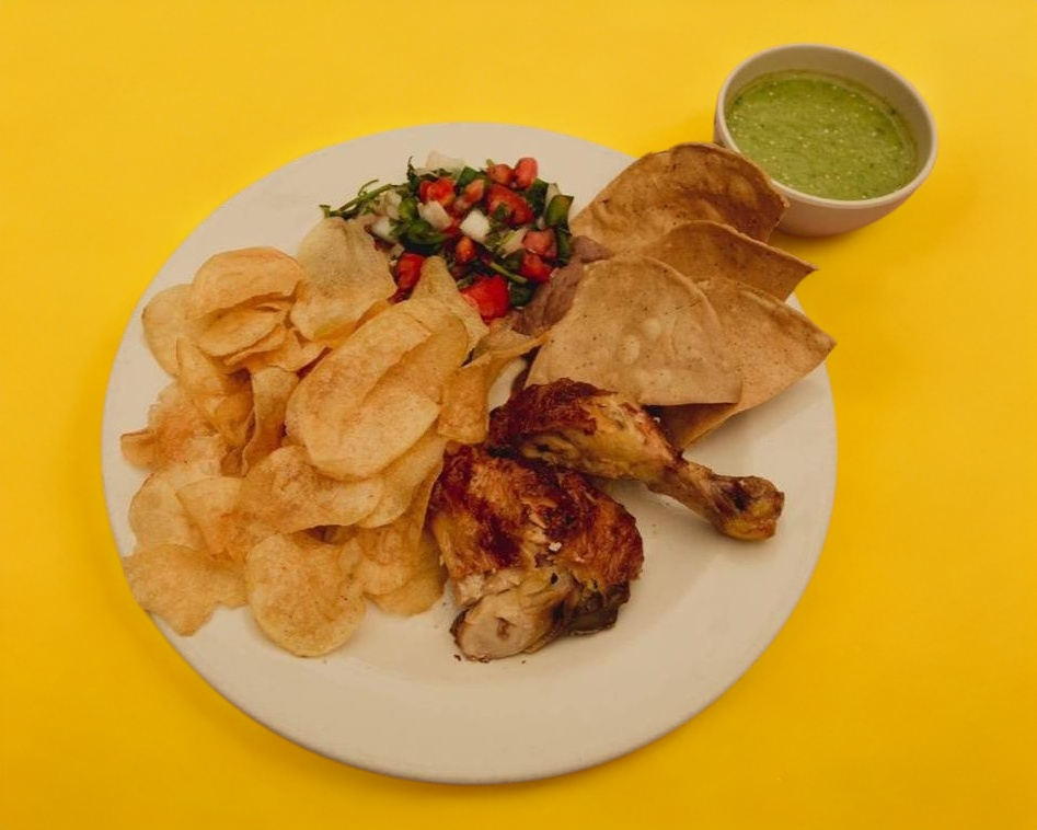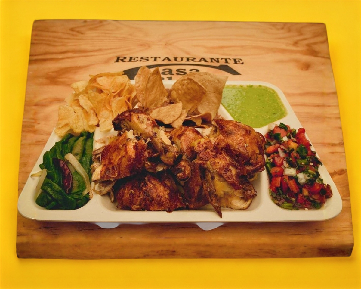 1 pollo rostizado acompañado de papas en ojales, frijoles, totopos, pico de gallo, arroz, guacamole, rajas, salsa y 700gr de tortillas.