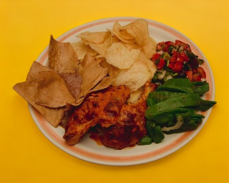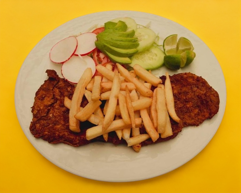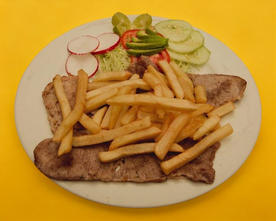 Acompañada de ensalada, frijoles, totopos, papas a la francesa, salsa y tortillas.
