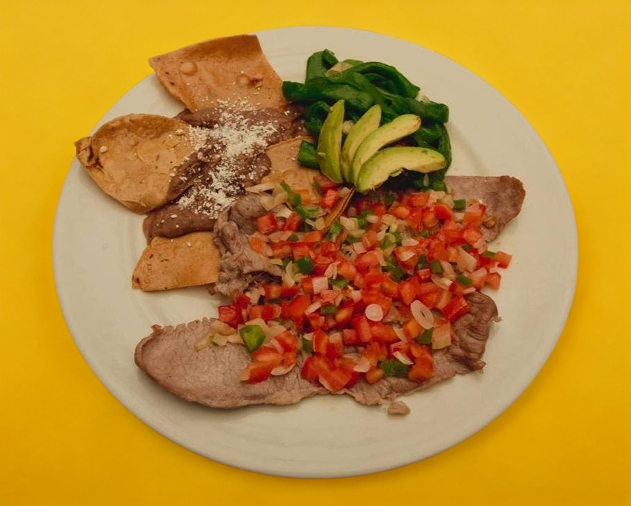 Acompañado de frijoles, totopos, nopales, aguacate y tortillas.